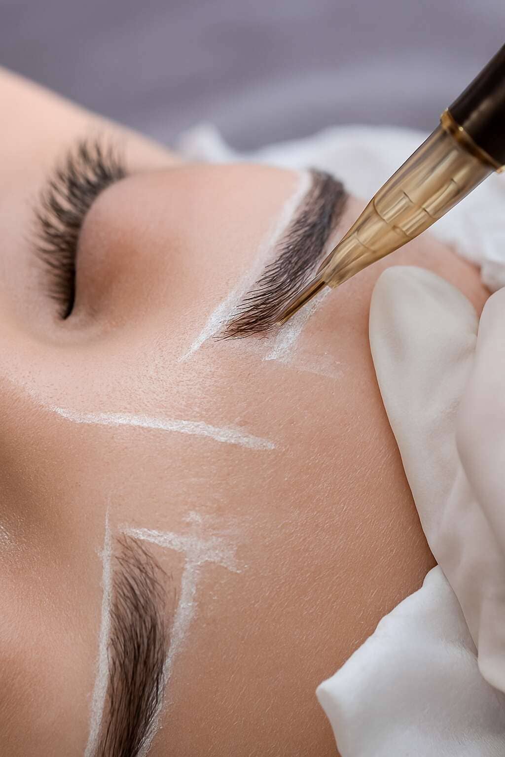 ابتدا متخصص با مداد آرایشی و خطکش طلایی، قوس مناسب ابرو را بر اساس نسبتهای فیفیس (Phi Face) طراحی میکند. سپس کرم بیحسی موضعی حاوی لیدوکائین ۵٪ به مدت ۲۰ دقیقه اعمال میشود تا فرآیند کاملاً بدون درد باشد.